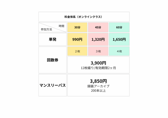 毎月3回程度しかクラスを受けられないという方には、全クラス共通の回数券(2ヶ月間有効)をご利用になることもできます。